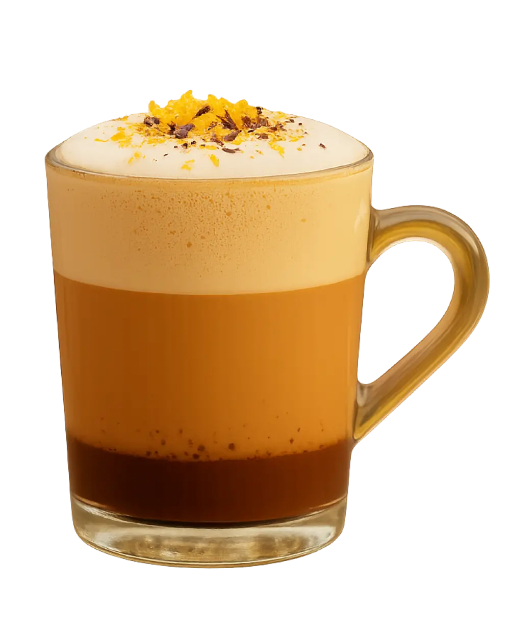 Adaugă laptele spumat deasupra și presară coaja rasă de portocală.