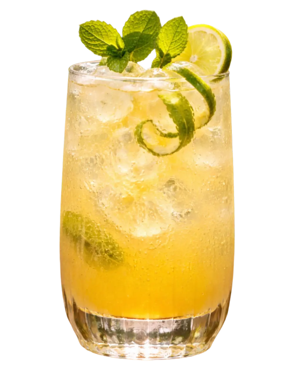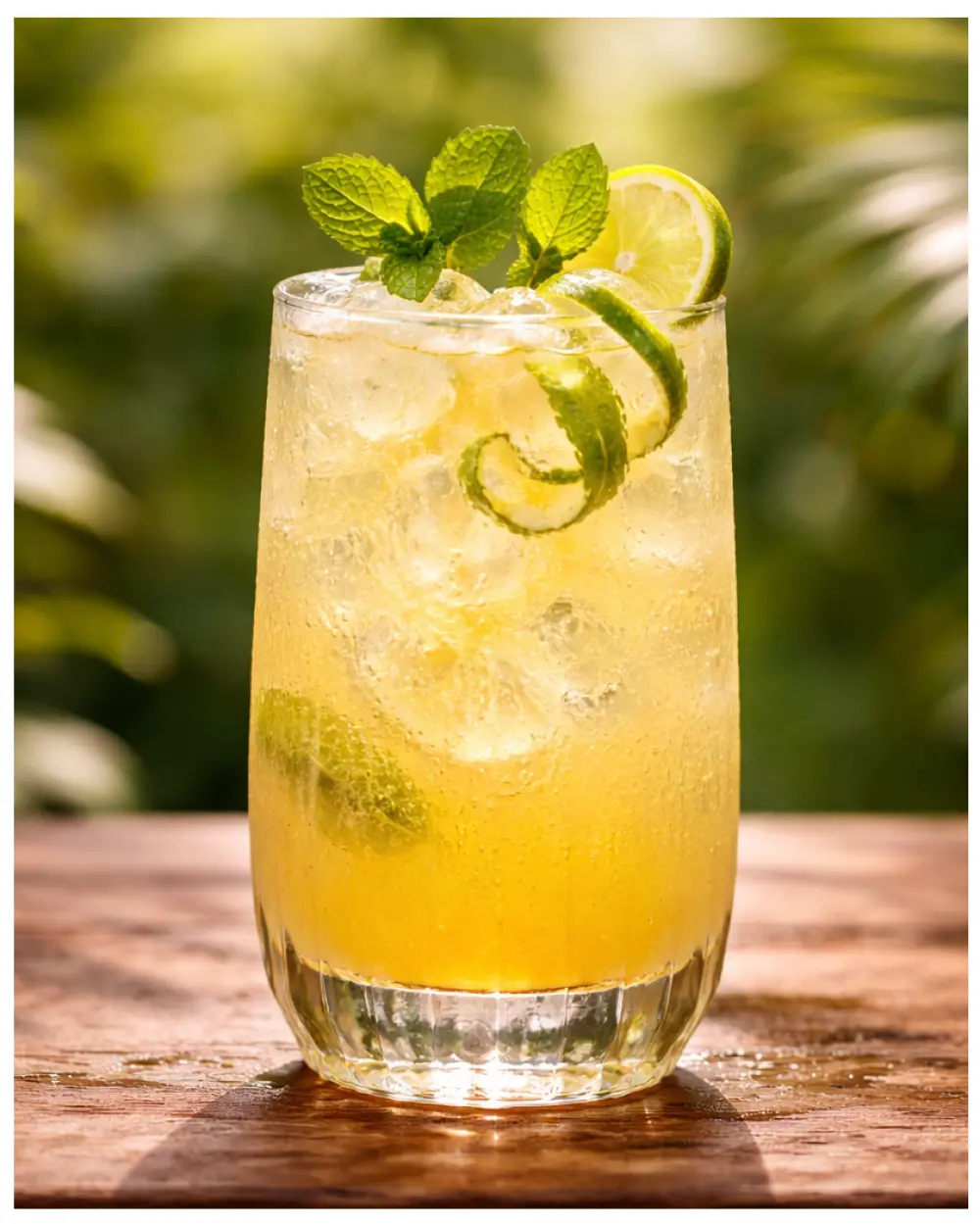 Decorează cu spirala de coajă de lime și frunza de mentă.